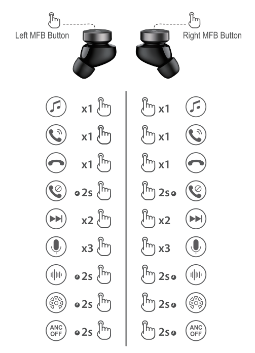 Ấn và giữ 2 lần tai trái/phải 2s : chuyển giữa các chế độ.