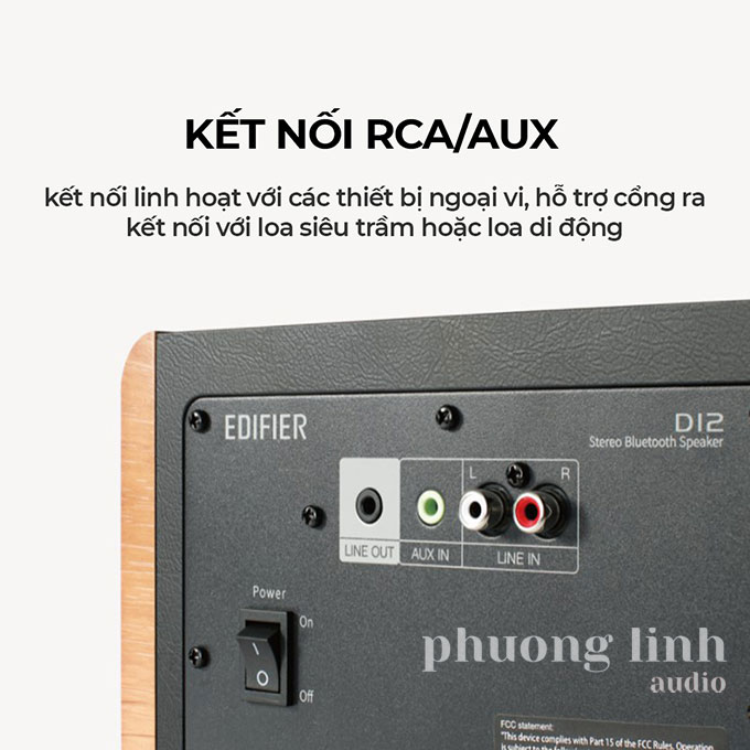 Mặt sau của loa bluetooth D12 là nơi chứa dây AC cố định, đầu vào RCA âm thanh nổi, đầu vào âm thanh nổi phụ trợ 3,5 mm và đường ra âm thanh nổi 3,5 mm. Có một đầu vào AUX và đầu vào RCA.