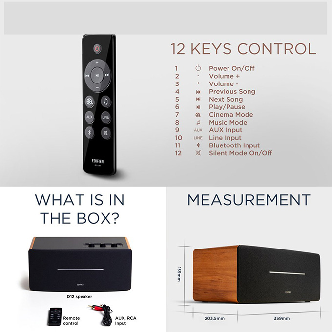 Điều khiển từ xa là một trong những tính năng đầu tiên được giảm giá trong tầm giá này. Bạn sẽ không gặp bất kỳ khó khăn nào khi điều khiển Edifier D12 từ khắp phòng.