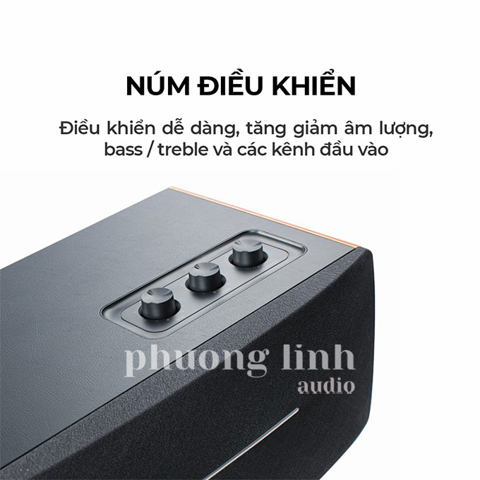 Nút xoay điều chỉnh âm lượng, bộ chọn đầu vào cũng có thể được sử dụng để bật và tắt loa cũng như một nút xoay âm trầm và âm bổng để điều chỉnh EQ của loa để bạn có thể có được âm thanh như ý muốn