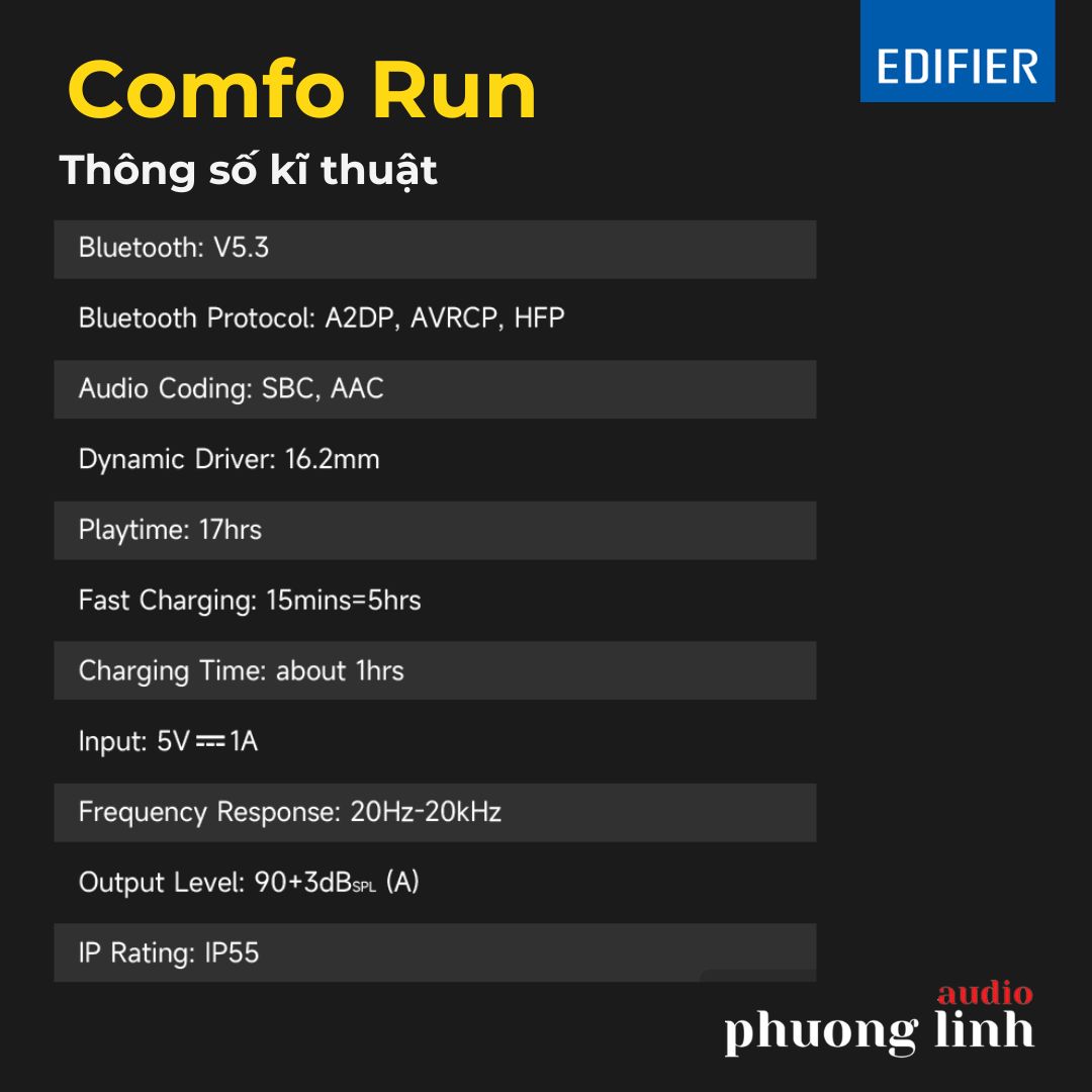 Tai nghe Edifier Comfo Run cung cấp trải nghiệm âm nhạc chất lượng cùng các tính năng tiện ích như chống nước và thoải mái khi đeo, phù hợp cho người dùng năng động.
